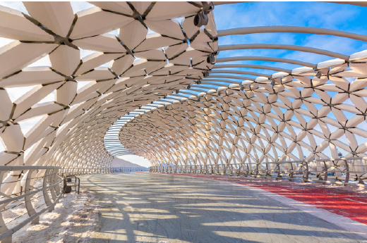 努爾蘇丹的標誌性建築!這座造型獨特的步行橋,宛如一條閃爍的巨型魚,2450片鋁製“魚鱗”在陽光下熠熠生輝。橋中央的鱘魚雕塑,象徵著好運和繁榮,吸引遊人駐足祈福。