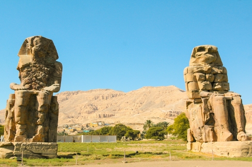 是阿曼和闐三世靈殿的遺址,兩座巨大雕像矗立路旁,氣勢磅礴。阿曼和闐三世的靈殿曾有三道塔門和主殿,規模可比卡納克神殿。靈殿因位於河岸平原,遭受尼羅河氾濫而毀壞。如今僅存巨像,仍可遙想昔日輝煌。