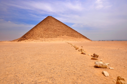 達舒是金字塔的發源地,第三王朝法老胡尼在邁敦嘗試興建金字塔未果。其子斯尼夫魯接續在達舒建造了彎曲金字塔,雖接近成功但仍有技術問題,最終成功建造了真正三角錐形的紅色金字塔。子古夫則於吉薩建造了規模最大的金字塔,這祖孫三代共同成就了古埃及金字塔的巔峰狀態。如果體力不錯,可挑戰陡斜的階梯,一探紅色金字塔內的神秘。