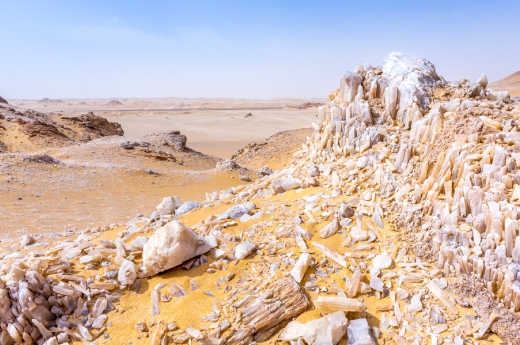 水晶山是埃及綠洲探險途中不可錯過的重要景點,這是埋藏在地表下的熔岩結晶體,經過漫長的地殼運動擠壓而突出地表,長時間風化後將覆蓋的岩層侵蝕,使結晶物直接暴露於空氣中,方解石水晶隨著時間終於發展成為白琧古洞穴,在地質學裡稱此為「露出洞穴」;此處有一座小型的岩石拱門,綴滿晶瑩剔透的方解石水晶,是極為完美特殊的照相背景。