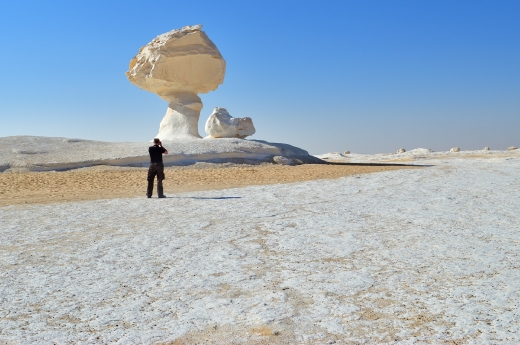 白沙漠的成因是成片雪花石受到風蝕的結果,造就各種奇岩怪石,像是蘑菇、動物、煙囪等等,令人不禁要為大自然的鬼斧神工嘖嘖稱奇,望著地面滿布白石粉末,視覺上還以為進入了冰天雪地,難以想像身處在沙漠當中。